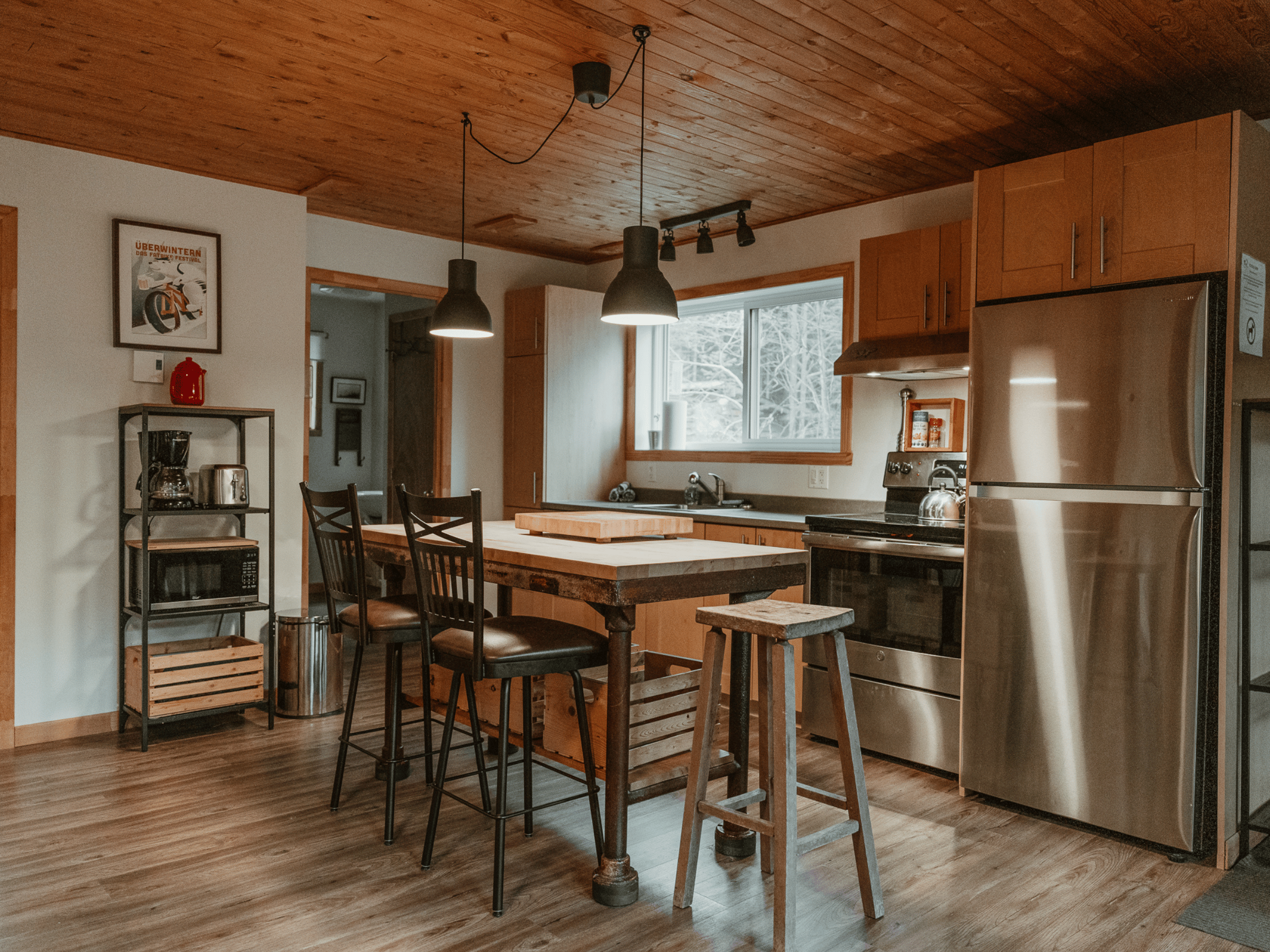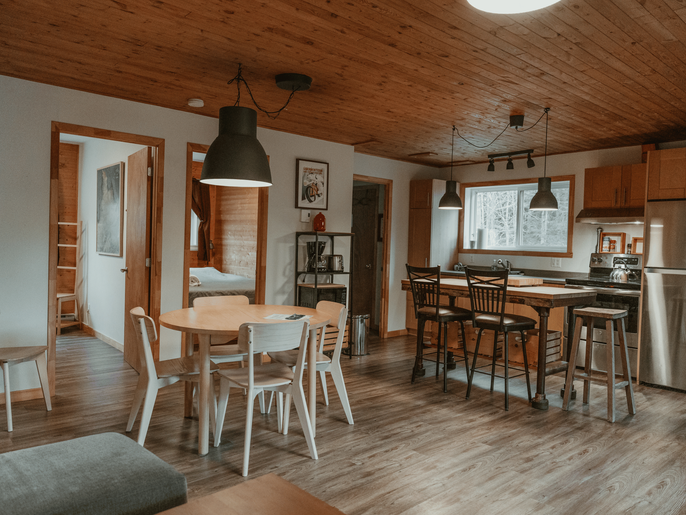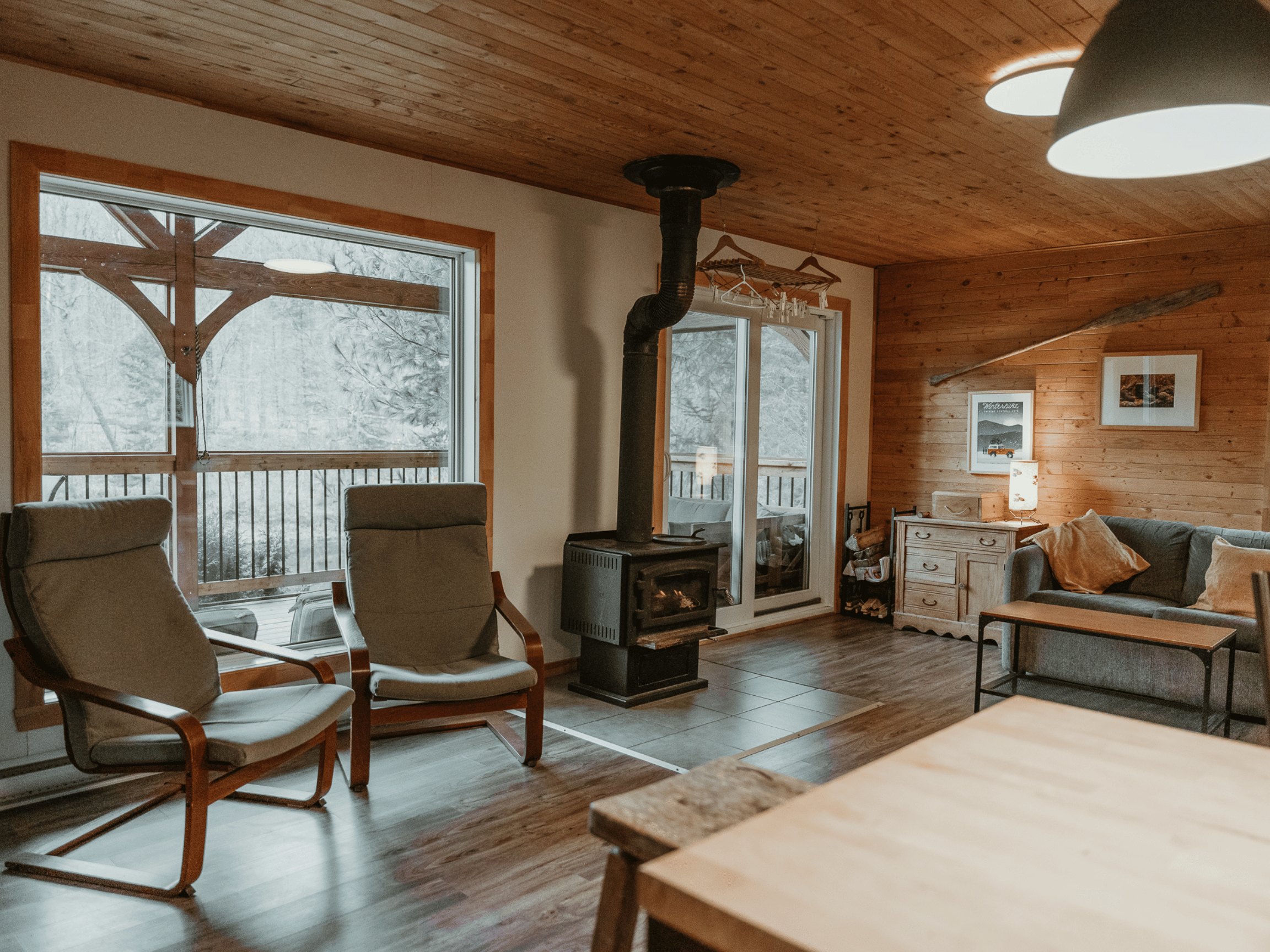 This peaceful cottage sits on the banks of the Bras-du-Nord River, 300 meters from the suspension bridge. It offers two bedrooms. The open-plan kitchen and living room are perfect for gathering around a meal or the wood-burning stove. In summer, there's a campfire pit right on the river.