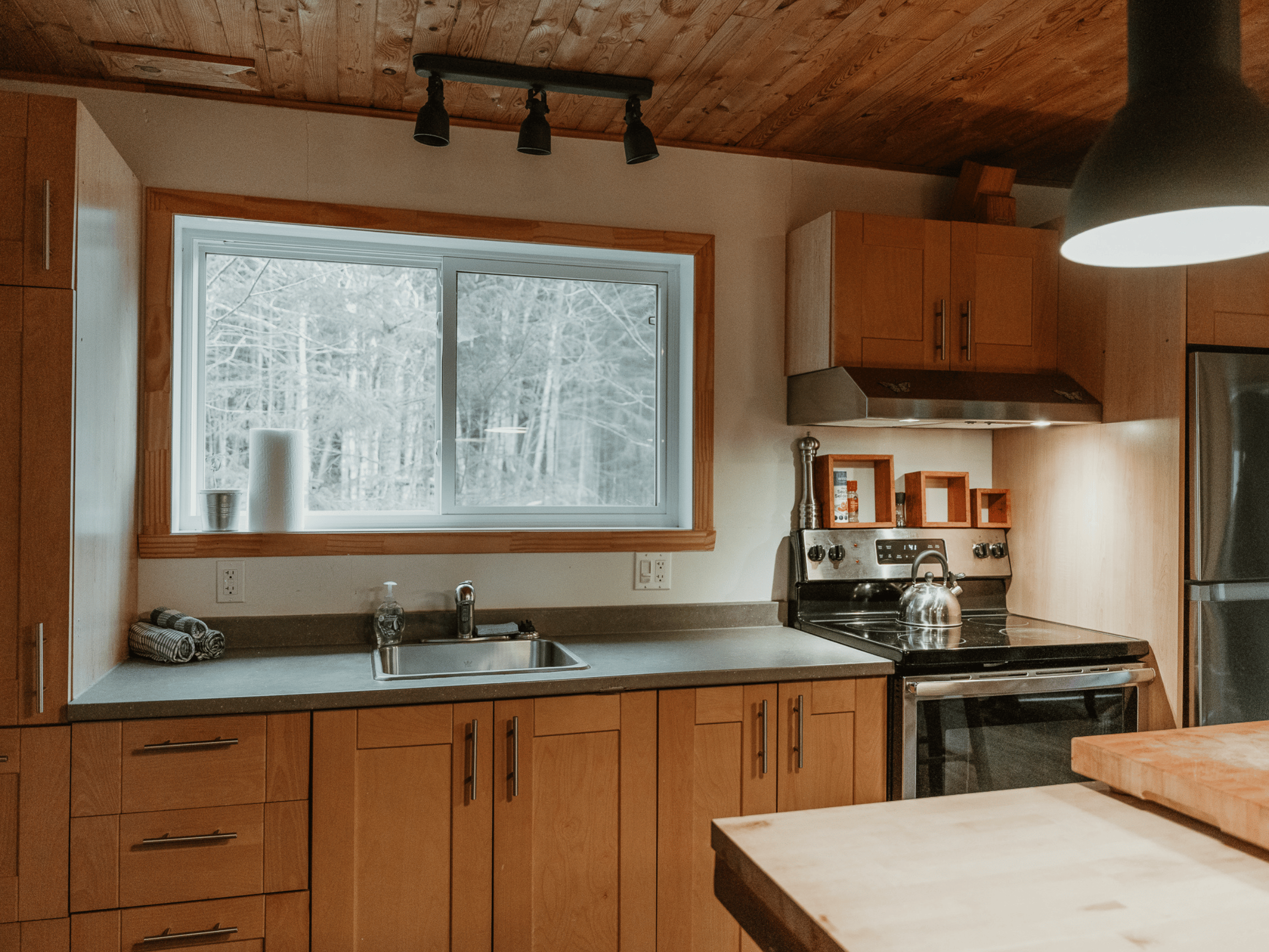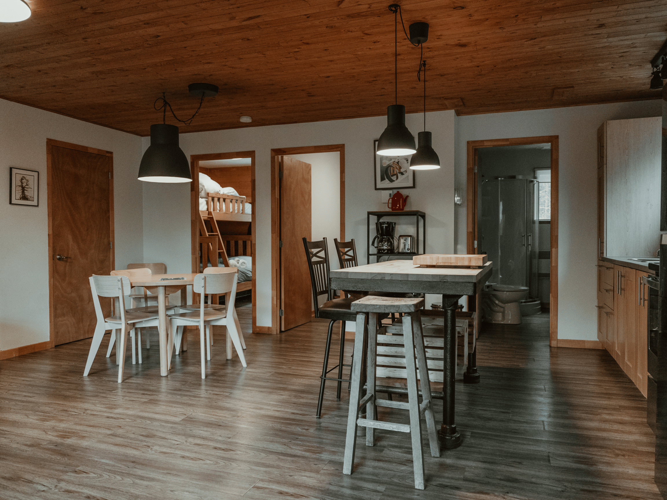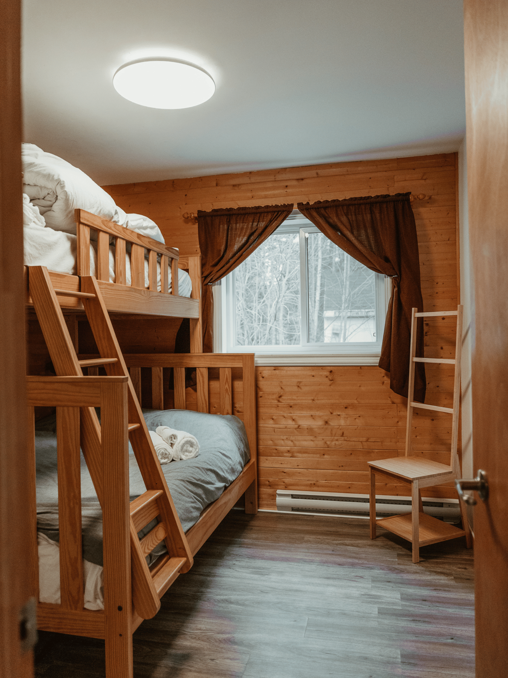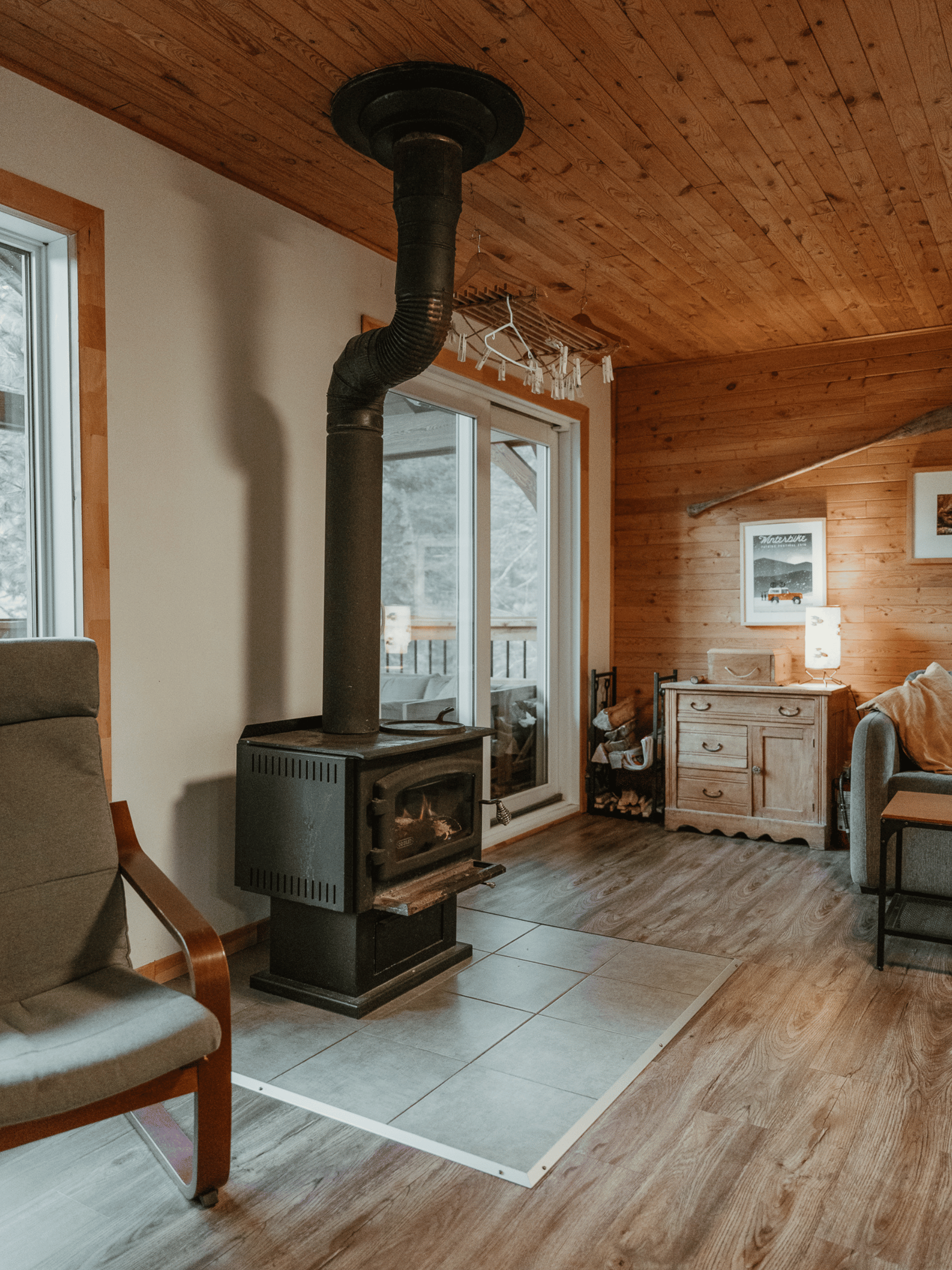 This peaceful cottage sits on the banks of the Bras-du-Nord River, 300 meters from the suspension bridge. It offers two bedrooms. The open-plan kitchen and living room are perfect for gathering around a meal or the wood-burning stove. In summer, there's a campfire pit right on the river.